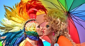 Two transvestites kiss during the gay pride parade at Copacabana beach in Rio de Janeiro, Brazil on October 13, 2013. AFP PHOTO / CHRISTOPHE SIMON (Photo credit should read CHRISTOPHE SIMON/AFP/Getty Images)