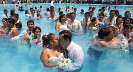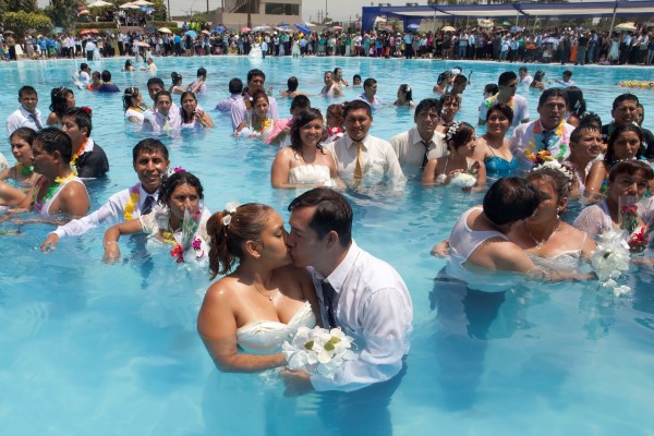 Couples get married inside a public pool during a mass wedding on Valentine’s Day in Lima on February 14, 2013. Over 200 couples participated in a community civil marriage organized by the municipality of Comas, northeast of Lima. AFP PHOTO/ERNESTO BENAVIDES (Photo credit should read ERNESTO BENAVIDES/AFP/Getty Images)