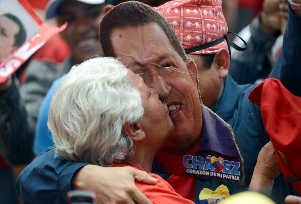 A woman kisses a supporter with a mask of Venezuelan President Hugo Chavez during a rally in Caracas on February 27, 2013, to commemorate 24 years of the Patriotic Rebellion of 1989. The “Caracazo” of 1989 was a wave of protests against the neoliberal reforms of imposed by the government of Carlos Andres Perez, in which some 3000 people were killed. AFP PHOTO/ Juan BARRETO (Photo credit should read JUAN BARRETO/AFP/Getty Images)