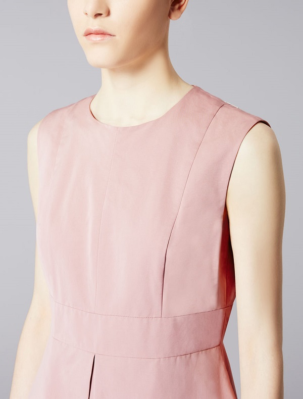 Quello che vi mostriamo oggi è un abito in faille di cotone e poliestere, decorato con taglio in vita e contropiego centrale sul davanti, pratiche tasche sui fianchi e chiusura con lampo invisibile sul retro.