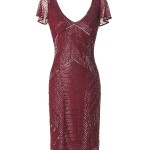 - Aitana si distingue per il motivo geometrico creato da file di lustrini disposte orizzontalmente, verticalmente e in obliquo. Lo scollo è tondo e profondo, le maniche sono corte e leggere.