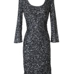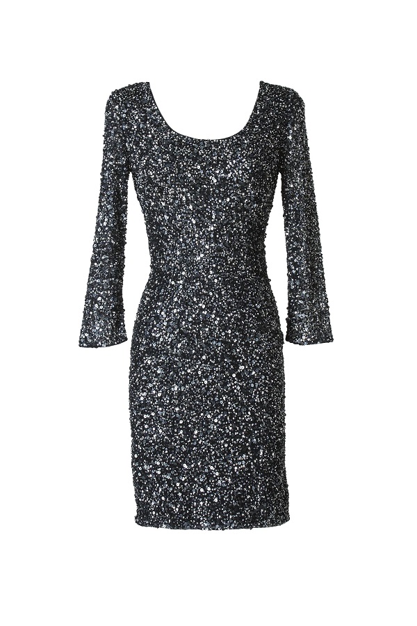 - Asiha è un trionfo di paillettes nei toni del nero e del grigio: una distesa di piccoli lustrini su un abito corto il cui imperativo è brillare! Lo scollo è tondo, le maniche lunghe e leggermente svasate.
