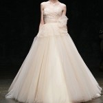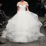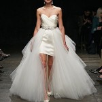 La sposa di Lazaro sa essere eccentrica e moderna, esuberante e sensuale grazie ai modelli più scivolati che avvolgono le forme e si posano sul corpo come una guaina o a quelli corti che, con un’esplosione di tulle, lasciano scoperte le gambe delle spose.