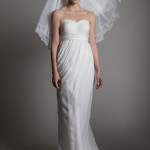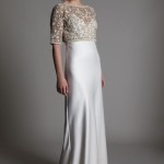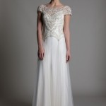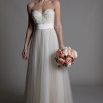 Abiti di ispirazione anni ’20, con taglio a sottabito, con piccoli inserti gioiello sui fianchi e ancora creazioni che ricordano le dive della Old Hollywood, con scolli all’americana, allacciati dietro al collo. Corpetti a cuore ricamati con fiorellini in rilievo con gonne in tulle, per l’abito giovane e romantico. Le maniche sono sempre in pizzo, che siano corte o tre quarti, giocano sempre con l’effetto vedo non vedo delle trasparenze.
