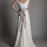 Scolli profondi a V posteriori, mettono in evidenza la schiena alla maniera delle dive di una volta, con motivi ricamati che incorniciano il montivo a V. Cinture in satin nelle nuance pastello, come il lilla, mettono in evidenza il punto vita e si sviluppano in fiocchi morbidi, impreziositi da fiori, che si posano sulla gonna dietro l’abito.