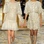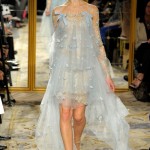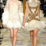 I colori? Bianco, grigino tendente all’azzurro, oro, champagne, sapientemente sposati per dar vita a elaborati ricami, piccoli fiocchi, giochi di tessuti e trasparenze,tulle per gonfiare le gonne.