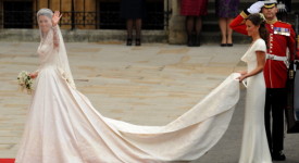 Kate Middleton (L) waves as she arrives with her sister, the Maid of Honour Philippa Middleton at the West Door of Westminster Abbey in London for her wedding to Britain’s Prince William, on April 29, 2011. AFP PHOTO / BEN STANSALL (Photo credit should read BEN STANSALL/AFP/Getty Images)
