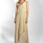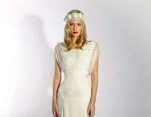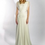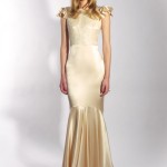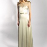 Di ispirazione anni ’30 l’abito con gonna morbida e decolletè con chiffon, portato con una coroncina di fiori shabby chic. E ancora atmosfere vintage per il modello in chiffon di seta un un giallo tenue, con fiorellini tra i seni. Il monospalla ha una gonna asimmetrica, che gioca con tre strati, in lunghezze diverse e il profilo, che si posa sul busto e la spalla è decorato con roselline in seta.