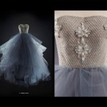Sono proprio i volumi asimmetrici delle gonne, in organza e chiffon che rendono unici gli abiti, le rouches una diversa dall’altra, i drappeggi e gli sbuffi di tessuto che danno volume alle gonne senza appesantirle e senza che si esageri con l’ampiezza. Gli abiti scivolati, sono ben attillatti alla figura, con corpetti che disegnano un decolleté geometrico, con punte in primo piano e inserti ancora una volta che disegnano delle geometrie definite sulla lunghezza.