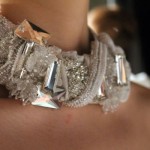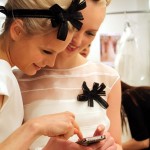 Il fiocco nero, in contrasto con gli abiti bianchi , avorio e nude, sono un leit motiv della collezione e talvolta li troviamo ad adornare le acconciature anni ’60 delle modelle. Gioielli importanti, come i macro collier con perle e pietre, diventano protagonisti dell’outfit nuziale, così come i cerchi di marabù portati al collo, per impreziosire abiti semplici, tagliati sotto il seno. E’ il gioco di trasparenze uno dei punti di forza della collezione, abiti con corpetti senza spalline, celati da pizzi, ricami preziosi realizzati a mano e semplice organza trasparente.