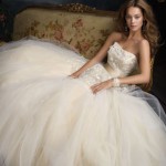 Gli abiti da sposa di Lazaro sono molto glamour e ricchi ricami che per la stagione 2014 si declinano con perline applicate rigorosamente a mano ed elementi floreali che vanno ad impreziosire le lussureggianti gonne e i corpetti a corsetto per creare sorprendenti.