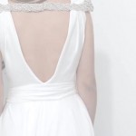 Una profonda scollatura sulla schiena caratterizza quest’abito, reso prezioso ed unico da una decorazione brillante che attraversa la parte superiore della schiena, proprio tra le scapole, da spalla a spalla o forse sarebbe meglio scrivere “da spallina a spallina”.