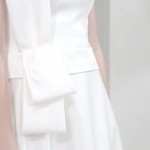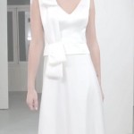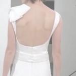 Schiena scoperta, asimmetrie sulla gonna ed un gioco di fiocchi e tessuto sul corpetto rendono quest’abito assolutamente originale nella sua semplicità.