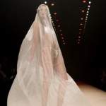 Ovviamente, i designers si sbizzarriscono letteralmente in fatto di vestiti da sposa: dopo i pizzi gotici noir e gli opulenti vestiti scarlatti dai tessuti broccati, non poteva certo mancare una sposa praticamente nuda, che è stata avvistata sulle catwalk di Berlino: la provocazione è opera dello stilista Kaviar Gauche.Definirlo abito pare quantomeno azzardato, visto che si tratta unicamente di un velo lunghissimo di seta e tulle trasparente che copre interamente la figura, scivolando con sensualità e leggerezza sulla pelle nuda. L’unico indumento indossato dalla modella era un completo lingerie particolarmente sexy, con reggiseno agganciato al perizoma attraverso una striscia di tessuto. Una tiara scintillante teneva saldo il lunghissimo velo che arrivava fino ai piedi.
