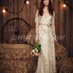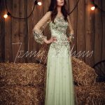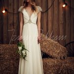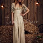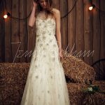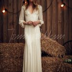 Le decorazioni preziose di perline, le maniche ad aletta e le sovrapposizioni di tulle di seta sono un tema ricorrente di questi abiti da sposa, che vanno dai toni del color carne a quelli dell’avorio e del bianco naturale. Ogni abito ha mantenuto la sua propria essenza eterea. Glitter adagiati sulle code di tulle, merletto in rilievo scintillante e gonne a più livelli a cascata sono gli elementi decorativi pù riusciti di tutta la collezione. Molti abiti da sposa Jenny Packham sono decorati con applicazioni di fiori e fogliame selvatici. Altri abiti spiccano per i corpetti che creano l’illusione del cristallo, con spalle aperte e scollature che che esprimono il glamour contemporaneo.