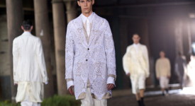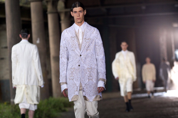 A model presents a creation by Alexander McQueen during the Spring/Summer 2014 London Collections: Men fashion event in London on June 17, 2013. AFP PHOTO/ANDREW COWIE (Photo credit should read ANDREW COWIE/AFP/Getty Images)