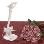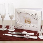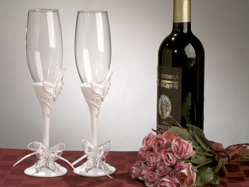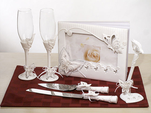 Una delle cose che non dovrebbero mancare alle nozze sono i due flute per il brindisi degli sposi quindi li trovate con la parte infewriore ricoperta di bianco e lòe farfalle sulla base. A completare il set ci sono anche i coltelli per il taglio della torta, la penna per scrivere e l’album per gli invitati, il guest book.