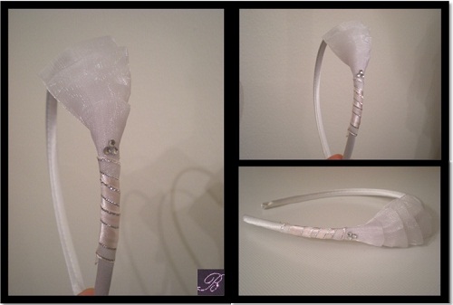 Qui vi elenchiamo i cerchietti che potete vedere qui nella foto gallery che sono tutti fatti dalle creazioni di B: il primo cerchietto che vedete è fatto di raso color bianco latte con un doppio fiocco impreziosito da dei Swarovski, il secondo cerchietto che vedete è fatto di raso color bianco con un fiocchetto di strass e un motivo di Swarovski ed infine l’ultimo cerchietto che è fatto di raso color bianco con un motivo plissé di organza color bianca e con dei Swarovski ed è stato finito con un nastro color rosa molto da favola e fiabesco.