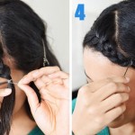 Iniziate ad intrecciare la sezione triangolare precedentemente formata. Proseguire con la treccia fino all’altezza delle tempie, quindi fissare con un mini elastico per capelli, meglio se trasparente.