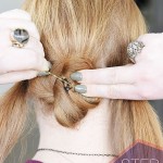 Partendo dalla coda di cavallo al centro, arrotolare la codina dall’elastico in fondo fino al primo elastico in alto e fissarlo poi alla base della coda di cavallo con una o più forcine. Ripetere sulla coda di cavallo a sinistra e poi quella di destra.