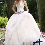 Le gonne sono in organza di seta, impalpabili e morbide, abiti da sogno per un giorno stupendo! Non mancano pizzi francesi, taffetà, macramé e roselline a rilievo. Le cinture a volte sono ricamate e con cristalli Swarovski. Insomma abiti ricchi di particolari e realizzati con tessuti pregiati.