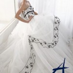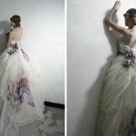 L’Atelier Aimée è il primo a proporre abiti colorati. Ci sono modelli in rosa, oppure in azzurro, in bianco, con pizzo nero, decori in blu, rosso, avorio. Sui tessuti dell’abito poi vengono dipinti a mano stralci di vite, di glicine, di fiori.