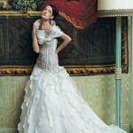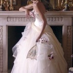 I corpetti sono di tulle ricamati con roselline e piccole foglie in color rame, avorio, avorio-rosa, avorio-argento. I pizzi chantilly decorano e rendono gli abiti vere opere d’arte per principesse dei nostri tempi.