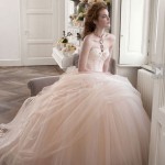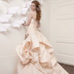 Il colore su cui è improntata la collezione è proprio il rosa in alcune sue sfumature, tendente anche un po’ all’arancio. Gli abiti hanno corpini stretti stretti e gonne voluminose in tulle con ricami e decorazioni originali, non mancano i pizzi importanti e vollant.