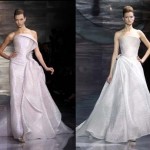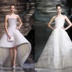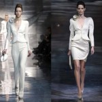Tagli asimmetrici e orli ondulati soprattutto sella linea delle giacche e pantalone e i tailleur. Armani dunque pensa anche a chi per scelta non indosserà l’abito canonico ma opterà per un completino bianco. La sposa in pantaloni non è mai il massimo ma bisogna sempre quardare una collezione nella sua interezza e negli spunti stilistici. Molti abiti sono infatti ideali per le seconde nozze.
