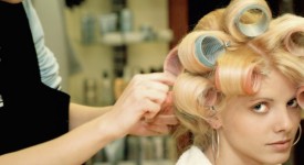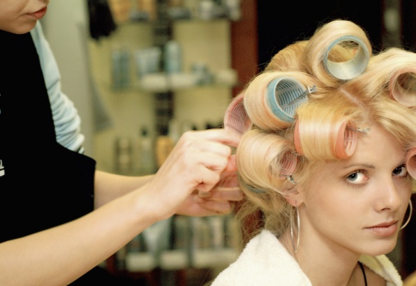 Female hairdresser adjusting curlers in a mid adult woman’s hair