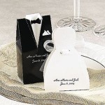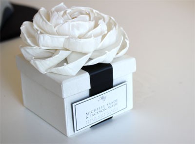 Ci sono le classiche scatolette di cartone nelle quali ci sono i confetti confezionati nel tulle, decorate con fiori bianchi e nastri neri, oppure delle deliziose borsettine, o ancora bomboniere a forma di sposo e sposa in nero e bianco.