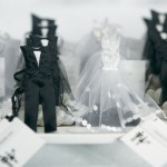 Possono essere scatolette, ma anche solo sagome di cartone e tulle che ricordano gli sposi. I colori sono due, mescolati per dare un tocco di classe ed estetico. Il nero è un colore elegante anche se durante i matrimoni viene utilizzato molto poco.