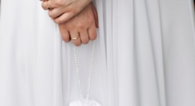 Bride holding small wedding bag with pearls