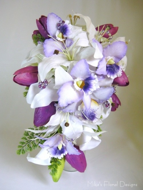 Ve ne proppongo alcuni, composti da candidi ed eleganti gigli, oppure colorati. Questi sono fiori carnosi, che si aprono e sui petali creano tante tonalità e nuance differenti di colore. Con le foglie creano composizioni particolari e piene.