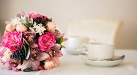 Bridal bouquet of peonies and coffee