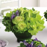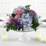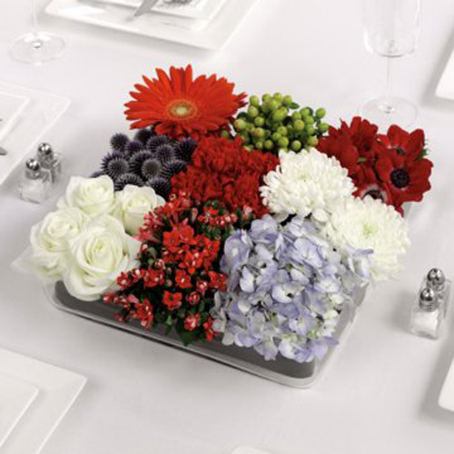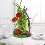 L’idea di centrotavola piuttosto piatti è insolita e particolare, un tocco moderno e senza dubbio nuovo. Se utilizzate vasi trasparenti di vetro al posto della schiuma e della spugna utilizzate sassi o graniglia colorata.