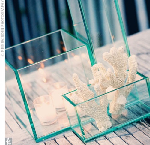 Un centrotavola con corallo dentro un vaso è molto marinaro, ma si può scegliere anche una candela con dei fiori se il ricevimento è serale. La torta?