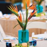 Gli uccelli del paradiso, fiori arancioni, sono un altro centrotavola poco costoso. La foto qui è di Geranium Lake Flowers. I fiori sono abbinati ad alcune conchiglie. Il trucco è semplice: fiori colorati, posizionati in modo estetico, possono dar vita a centrotavola a basso costo.