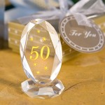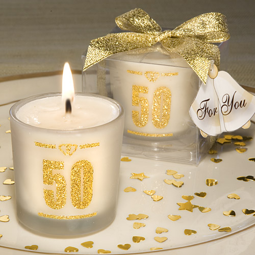 Questi centrotavola sono perfetti. Potete acquistare piccole candele bianchi in deliziosi bicchierini bianchi in vetro sui quali è apposta la scritta cinquanta, ma anche segnalibro da regalare agli ospiti come bomboniera, insieme ai confetti e oggettini da mettere sul tavolo che ricordano la ricorrenza.