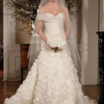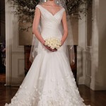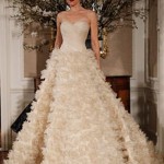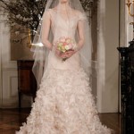 Di questi abiti realizzati con ricche stoffe mi piace l’idea della lavorazione, riporti che sembrano avere la forma di fiori, quasi rose che rendono l’abito qualcosa di bello, romantico ed elegante. Ad accompagnare questi abiti dei bouquet perfetti e acconciature semplici.