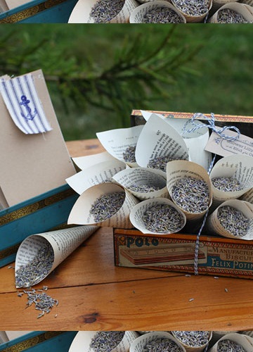Per realizzare i coni vi serviranno dei fogli di carta rettangolari (scegliete voi le dimensioni in base alle vostre preferenze) nei colori che preferite o, come nella foto, con la decorazione di una pagina stampata o, ancora più romantico, di uno spartito musicale. Quando avrete scelto la carta per i vostri coni attorcigliate ogni foglio e chiudetelo con della colla da stendere al fondo e all’estremità del foglio. Se preferite applicate dei fiocchi alla punta di chiusura o, in alternativa, applicate due punti di sutura con un ago e del filo da ricamo lilla.