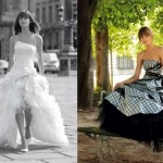 Ed infine non può mancare il modello di abito da sposa molto originale e sofisticato in stile country con la gonna lunga fatta con un tulle color nero e doppiata da un tessuto fatto a quadretti bianchi e neri.
