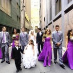 Guardate che bell’effetto creano i bouquet con il nastro colorato che riprende le cinture delle damigelle. Che dire poi del contrasto tra gli abiti di queste ultime, un bel viola, con quello della sposa?