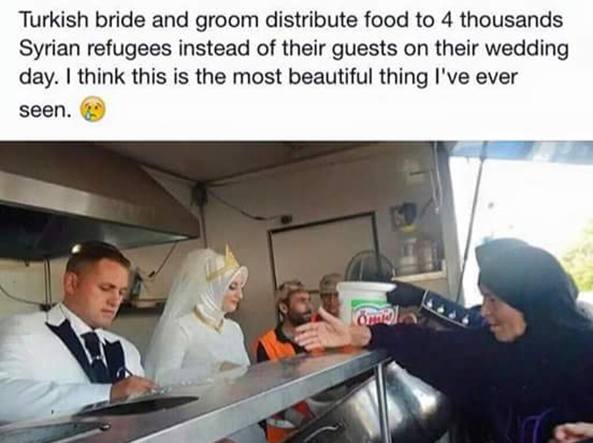Invece del tradizionale banchetto nuziale, una coppia di Kilis ha voluto condividere la propria felicità con i meno fortunati, in fuga dall’Isis. Niente festa di nozze dunque per i due sposi turchi che hanno voluto festeggiare il proprio matrimonio invitando a banchettare con loro 4.000 profughi siriani.