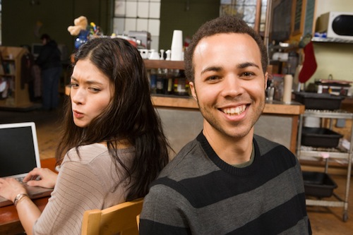 Young Woman at Laptop with Man at her Back