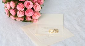 5 Dicembre 2012 fleurs d’eventi partecipazioni Wedding bouquet of pink roses and wedding rings on invitation