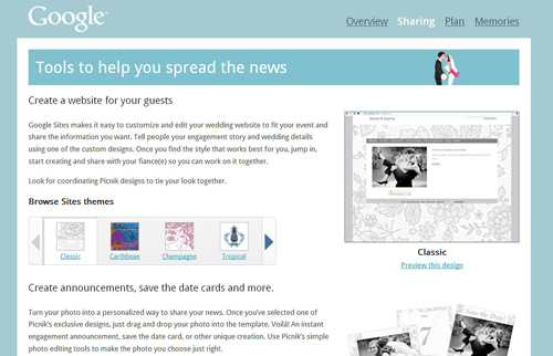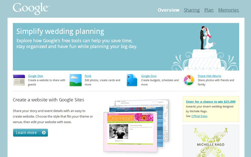 L’offerta è vasta. Si va dal sito web del matrimonio con i template di Google Sites alla modifica delle foto con l’editor Picnik, oltre alla possibilità di gestire gli invitati alla cerimonia, tenere sotto controllo le date importanti, le entrate e le uscite del budget a disposizione e di raccontare ad amici e parenti la storia della coppia (caso mai avessero perso qualche passaggio fondamentale). Infine, l’opportunità di condividere la propria lista nozze con Google Docs.