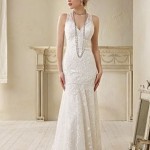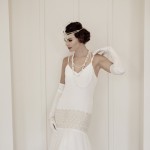 Lo stile anni ’20 prevede abiti scivolati, a sottabito, con spallini a filo, schiena se vogliamo in primo piano e applicazioni preziose come frangette di cristalli o pizzi in sovrapposizione. Il primo modello che ho scelto per voi è di Alfred Angelo, con scollo a cuore, vezzosamente celato da uno strato trasparente di pizzo, che diventa spallina. Lindsay Fleming è una designer specializzata in abiti da sposa vintage e sul sito ufficiale trovate molte fonti di ispirazione, come il modello in seta Bette, o le altre creazioni semplici ma abbinate sapientemente ad un guanto in satin o ad un lungo filo di perle.