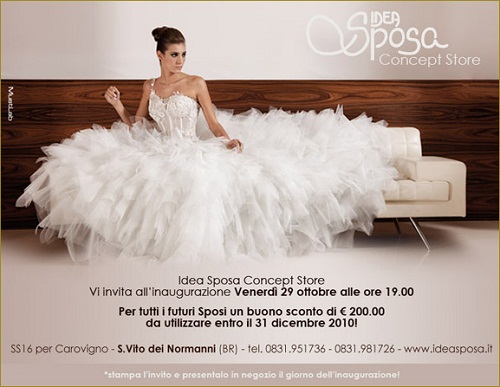 Stasera alle ore 19:00 ci sarà l’inaugurazione di Idea Sposa, il più grande concept store della Regione Puglia, presso la nuova struttura in SS16 per Carovigno in San Vito dei Bormanni (Br). Stampando l’invito e consegnandolo al negozio si riceverà un buono sconto di euro 200 da spendere entro il 31 dicembre 2010.