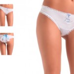 Il reggiseno, semplice e femminile, accompagna perizomi, coulotte e slip di varie forme sui quali sono applicate diverse decorazioni: a scelta, a seconda dei gusti della futura sposa, si potranno sfoggiare slip sui quali sono ricamate le scritte “Yes, I do” e “Last Night Out” (tradotte, “Sì, lo voglio” e “Ultima notte fuori”) o coulotte che, sul lato posteriore, sfoggiano un piccolo velo sul quale è applicato un fiocco azzurro.